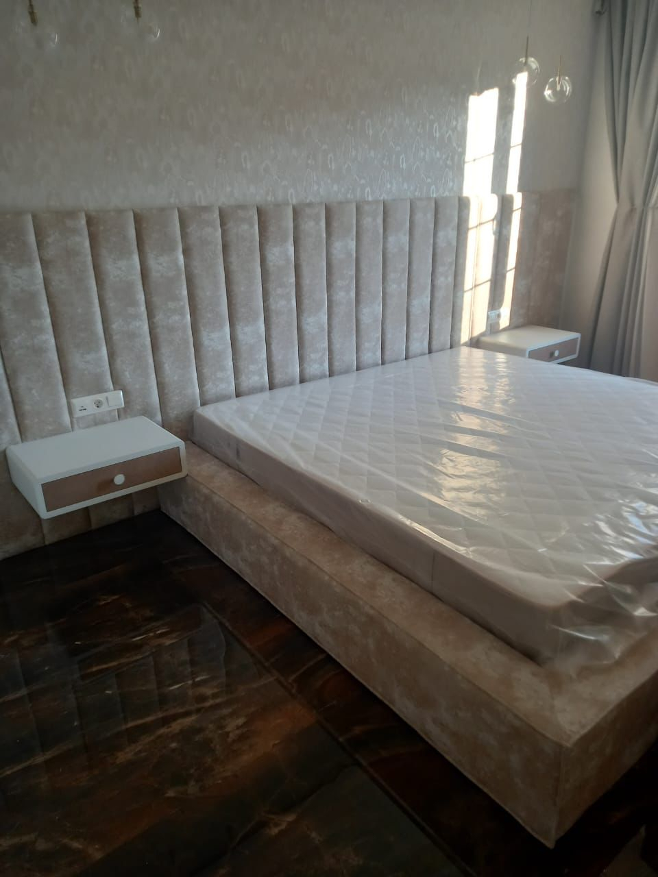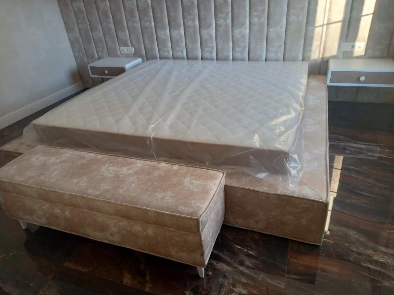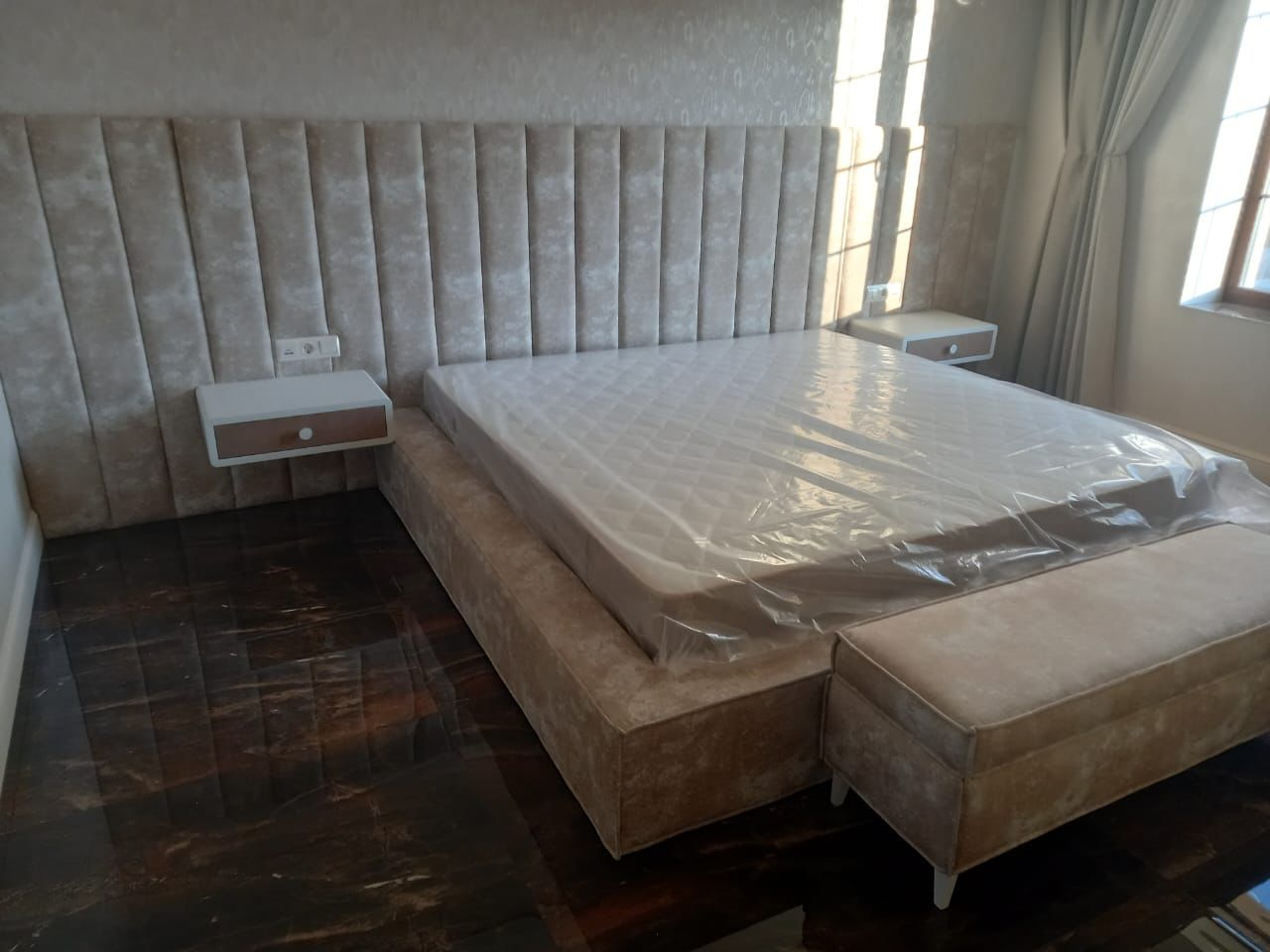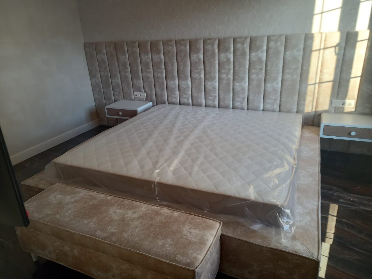 Кровать с мягкой стеновой панелью и прикроватной банкеткой: Ваше идеальное спальное место, созданное по вашим меркам.
