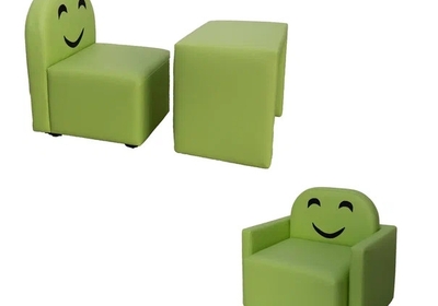 В состав набора входит стол и стул. Стол при необходимости можно убрать за стул, получится удобное кресло для сидения. Каркасы изготовлен из фанеры, наполнитель ППУ высокой плотности, материал обивки: экокожа. Стол длина 500, ширина 300 мм. Стул: ширина 380 мм.